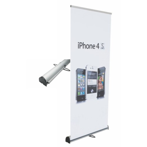 Exhibitor who has elegant sides, the characteristic shape of the base in a semicircle, joined to the base with an innovative design. In black aluminum with prestigious chrome side trim roller and a top profile for quick fixing of the print. Composed of an X-system with supports for the quick attachment of the press and the rear shaft for support on the ground. It can easily be moved. This standart measures exactly 85X 200cm